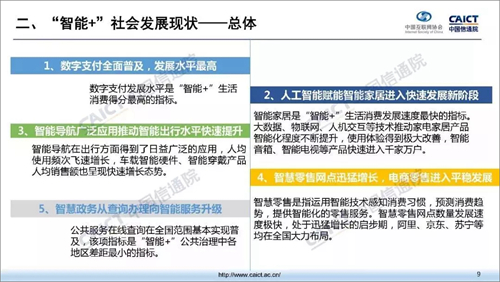《报告》认为,未来我国“智能+”社会发展水平将快速提升,有三个方面值得关注:一是智能生活消费将领衔“智能+”社会发展,以智能人机交互、智能服务推送等形式,实现城乡居民在购物休闲、家居生活、交通出行等领域的快速响应、个性定制和按需服务;二是智能公共治理将提升“智能+”社会基准线,实现跨层级、跨地域、跨系统、跨部门、跨业务的公共治理协同,形成全程在线、高效便捷、精准监测、高效处置、主动发现、智能处置的智能管理体系;三是智能生产将是“智能+”社会的主阵地,基于平台的生产方式向全行业演进,生产体系迈向组织重构、动力变革、模式创新的新阶段。