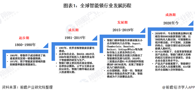 1865年耶鲁成功缔造了耶鲁圆筒锁,直至1971年用于智能家居领域的微控制器和微处理器诞生,全球智能锁行业的发展起步阶段结束,进入行业发展成长期。经过多年的发展,目前全球智能锁行业技术逐渐成熟,智能锁行业在5G的推动下迈入发展成熟期。
