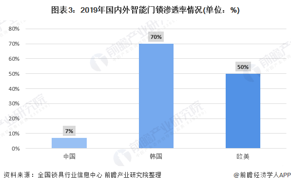 根据全国锁具行业信息中心公布的数据显示,2019年中国智能门锁渗透率为7%,而韩国渗透率高达70%,欧美国家渗透率也达到50%,中国智能门锁市场渗透率较低,增长空间巨大。