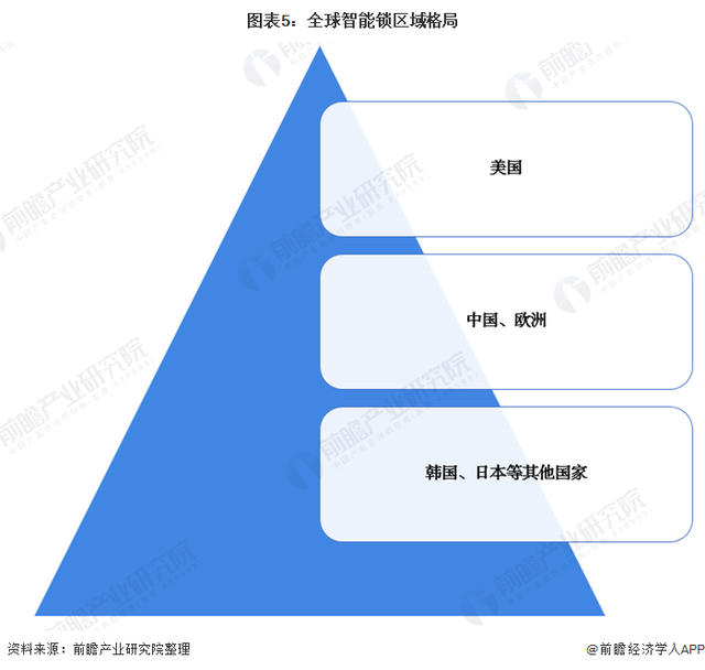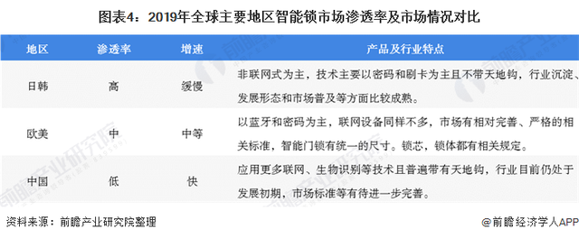 更高比例的单户住宅,以及消费者对智能家居自动化或安全服务的更大兴趣,使美国成为迄今为止智能锁最大的市场,其他地区的消费者有着不同的优先级。在西欧,温度控制更为重要,智能锁通常不会集成到智能家居服务中。在韩国,SK电信,韩国电信或LG U-Plus在多住户单元中安装的智能家居解决方案通常具有配备商用级电子锁系统的共享入口。近年来随着智能锁技术的成熟及市场认知度的提升,中国在智能锁领域已处于全球领先的地位。无论是产品形态,还是功能,亦或是品牌和企业数量,中国均已领先于全球大部分国家。
