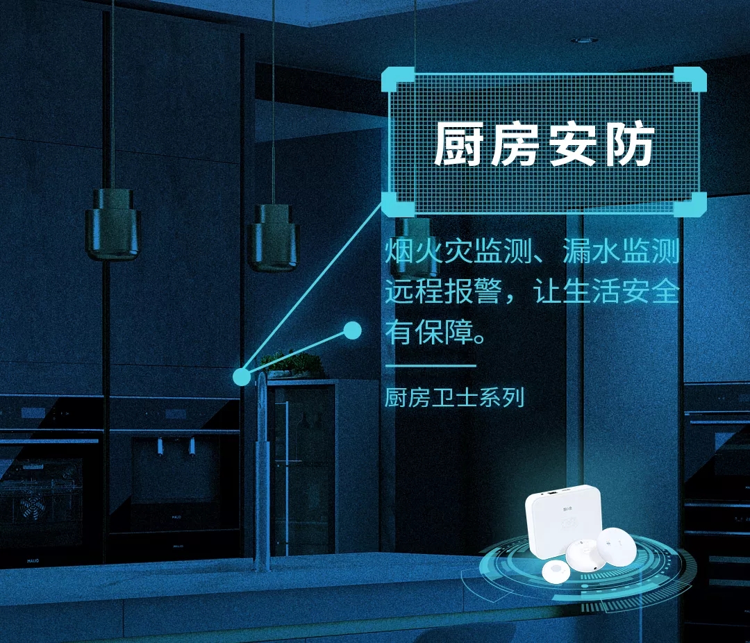保障厨房用水用气安全,通过实时监控厨房可燃气体及烟雾浓度,发现超标立即发送报警信号, 自动关闭燃气阀门,并自动开窗换气,防止危险发生。水浸探测器主要为防止管道漏水或忘记关水龙头时造成溢水现象,对于家有老人或者小朋友来说,十分有必要。