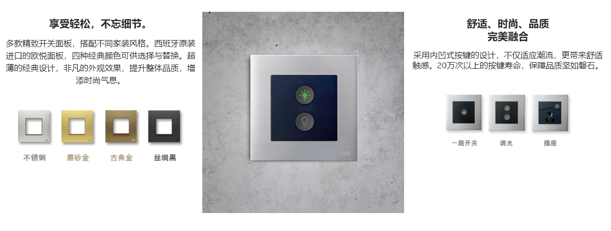 现代面板开关不再仅仅是一种基本的日用品,还是具有迷人设计的艺术品。通过创新技术与美学的结合,它们可赋予生活空间魅力与生命力。ABB的面板开关系列产品,满足您对个性化空间质量与设计的高要求,颠覆传统设计理念,重新定义照明开关。