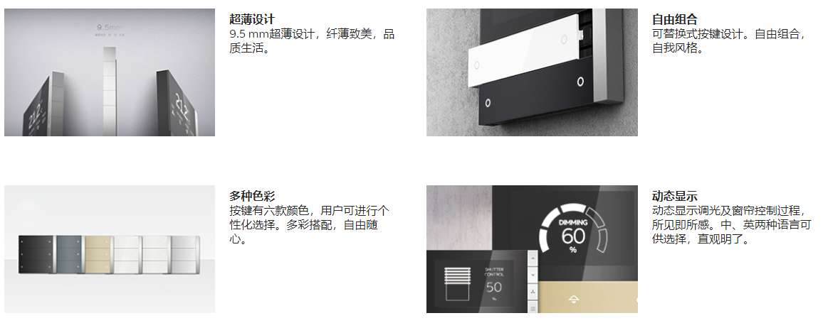有不同的外形、颜色和材料可选,能够满足各种需求。KNX控制元件分为德典carat®系列、精钢系列、 德韵solo®系列、德炫axcent®系列和德悦future® linear系列。所有上述系列的传统面板开关均可提供,与KNX元器件配合使用无任何限制。
