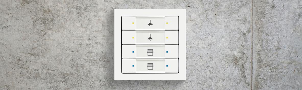 融入色彩概念的多功能控制元件可以满足对舒适度和技术的最高要求。每个翘板带2个三原色LED灯,颜色协调一致,便于一眼识别功能。此外表面还可以附加象形文字。翘板的每一边都有单独的功能,如切换场景模式。这样一个4联控制元件便变成了8联控制元件。